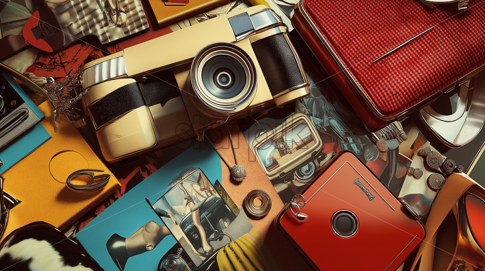 A retro-futuristic illustration fashion, gadgets, and cultural icons