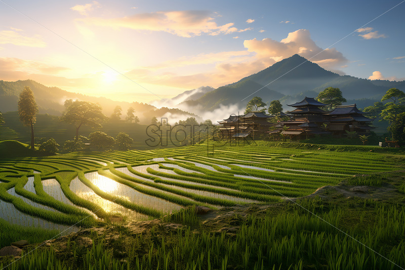 Home » Shop » AI Illustration » A rice plantation that is located on a hill in the countryside