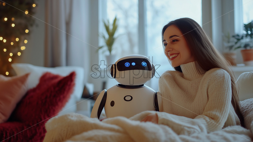 Home » Shop » AI Illustration » a robot assistant at home helping the family, smart techno future