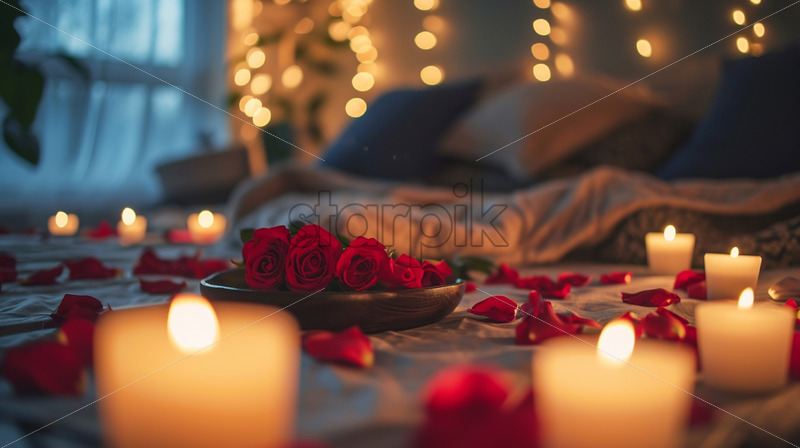Valentine’s Day postcard with gift heart shape, roses and candles on white background