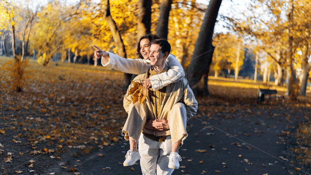 A romantic couple in an autumn park. Man carrying his woman on his back along the path while she is showing something, smiling. Autumn atmosphere, yellowed trees and leaves around