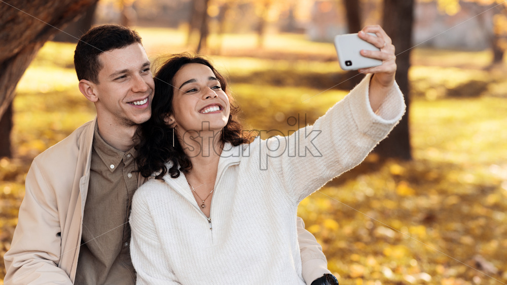 A romantic couple in an autumn park. Smiling and taking selfies. Autumn atmosphere, yellowed trees and leaves around