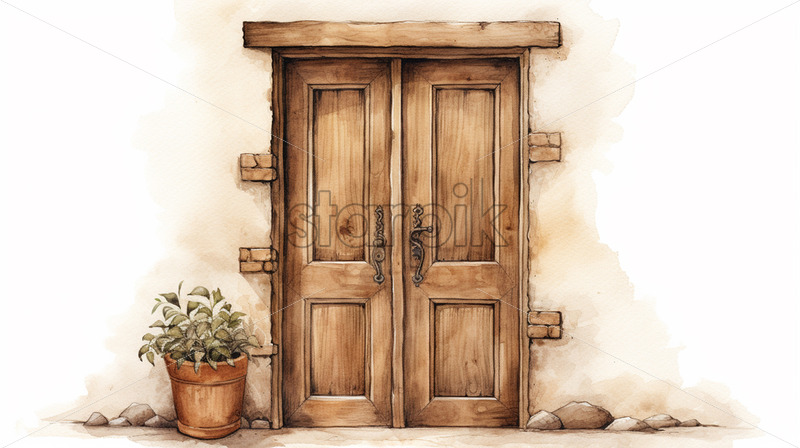 A rustic door painted in watercolor in clipart style