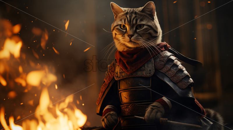 A samurai cat against the background of flames