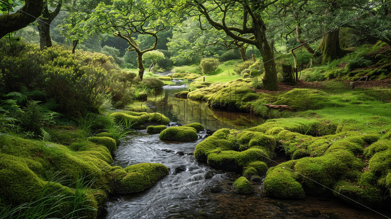 A scene in the moss-covered forest on the bank of a river