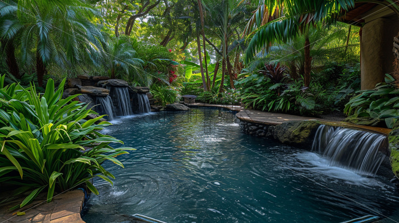 Home » Shop » Uncategorised » A serene backyard pool adorned with water features and surrounded by lush greenery