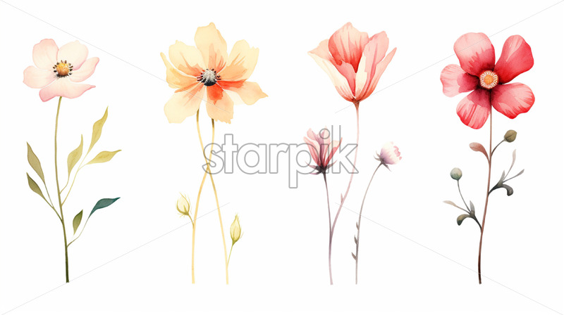 A set of flowers painted in oil on a white background