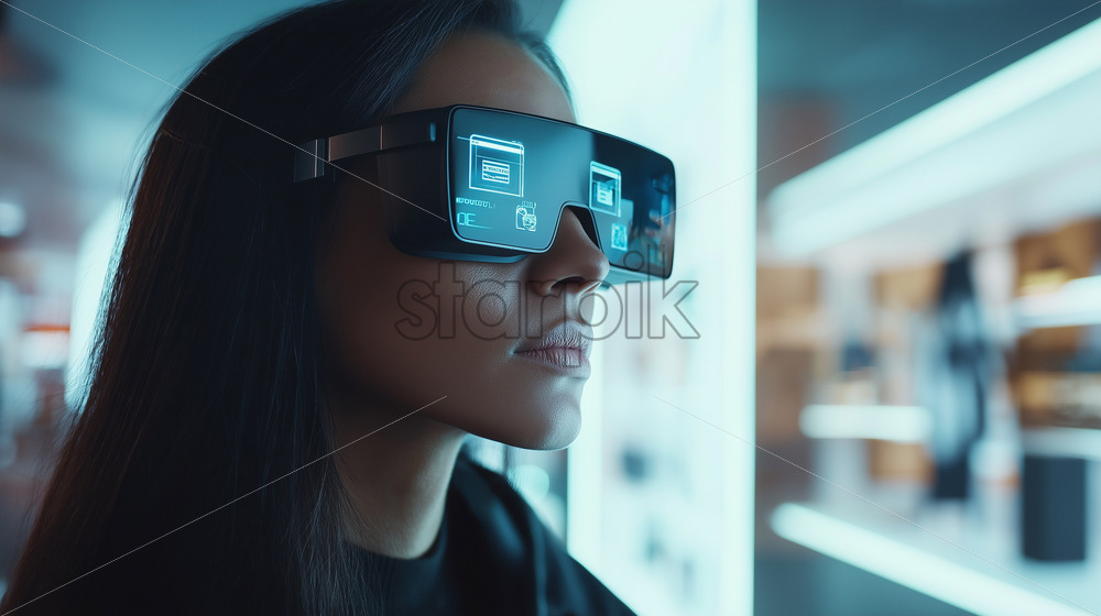 Home » Shop » AI Illustration » A shopper wearing stylish AR glasses in a high-tech store