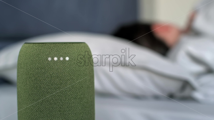 A sleeping woman turning off alarm clock on a portable wireless speaker with 4 luminous diodes