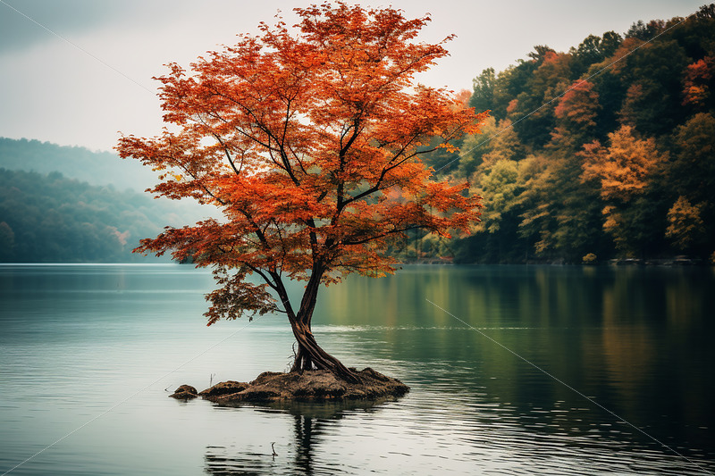 A small tree growing on a lake