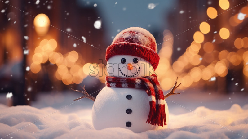Home » Shop » Uncategorised » A snowman in the city with festive lights, winter holidays card background