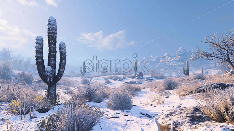 A snowy desert, with cacti covered in snow
