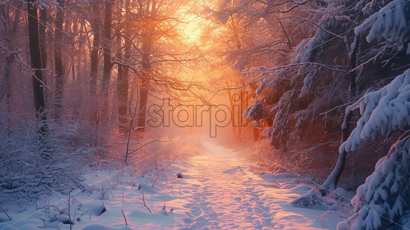 A snowy path in a winter forest at sunset