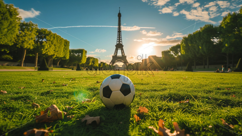 A soccer ball on the grass, the Eiffel Tower in the background