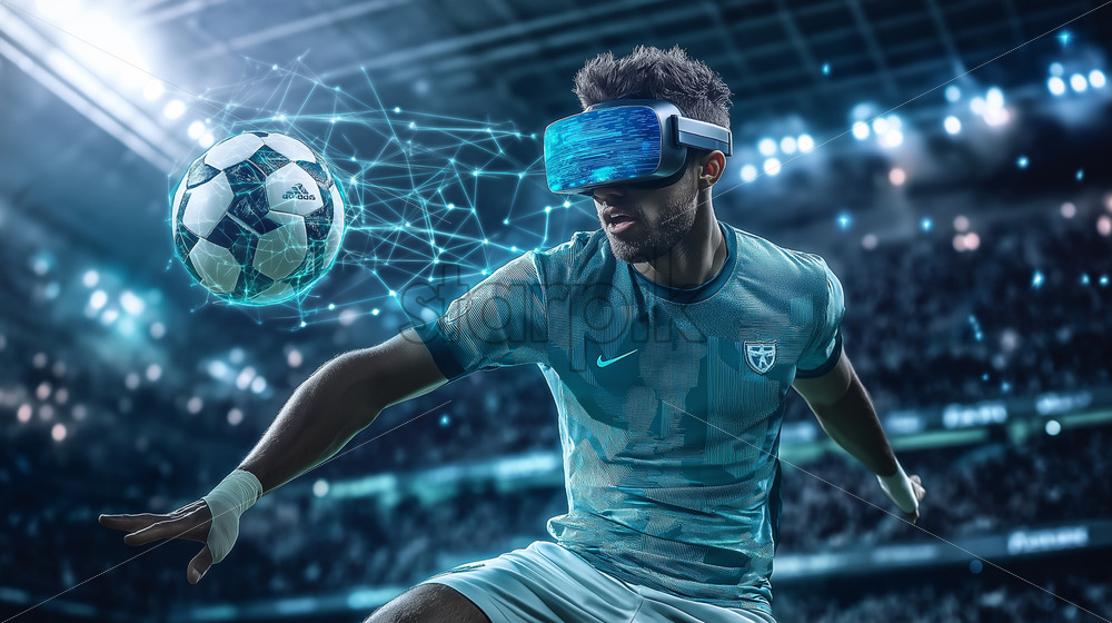 A soccer player scoring a goal while wearing an augmented reality headset