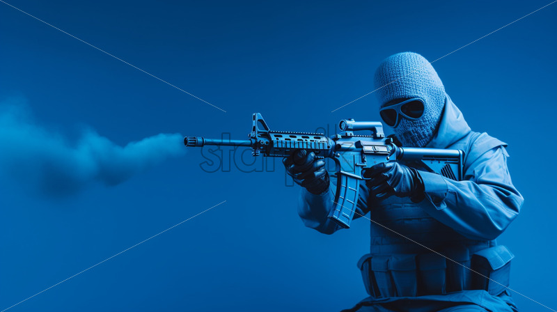 Home » Shop » Uncategorised » A soldier with a gun in his hand on a blue background
