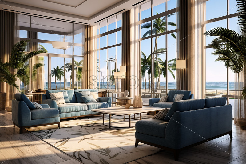 Modern house architecture in the country side with clear glass wall in the lounge and dining table on a bright ambience cozy couch with indoor plants and shelves