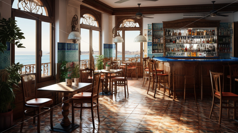 A delightful photo capturing the charm of a roadside coffee shop during the day, taken from outside, featuring wooden chairs and tables, exuding a retro ambiance through stylish photography.