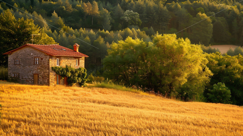 A stone house in a field of wheat