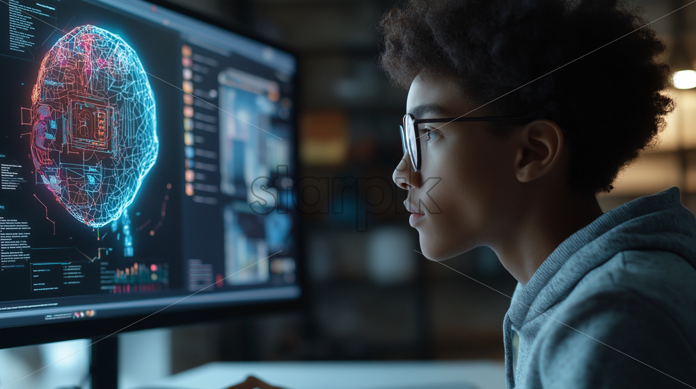 Home » Shop » AI Illustration » A student interacting with a quantum-powered AI tutor