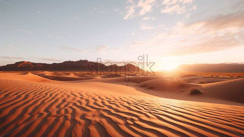 A stunning desert sunrise, casting long shadows over the dunes and rocky terrain