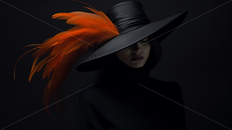 A stylish woman with a hat with orange feathers