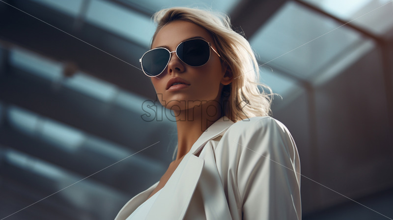 Portrait of a smiling blonde woman in sunglasses in Cannes sitting on a rock, France. Multiple floating yachts on the background