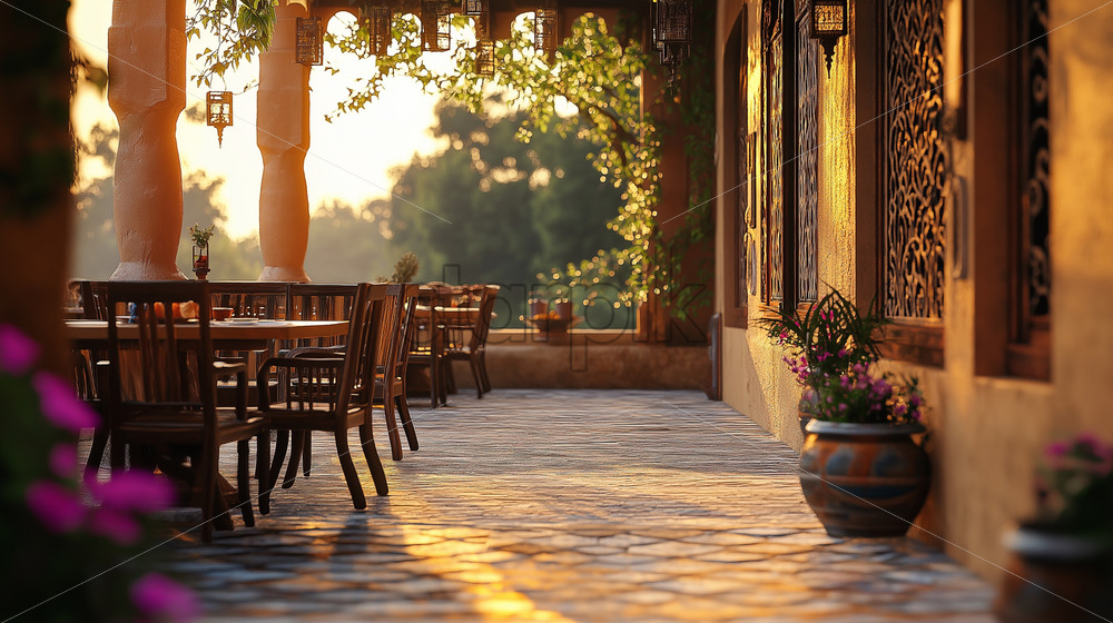 Pink climbing roses in pots at an outside cafe with mint green tables and chairs Royalty Free Stock Video Footage