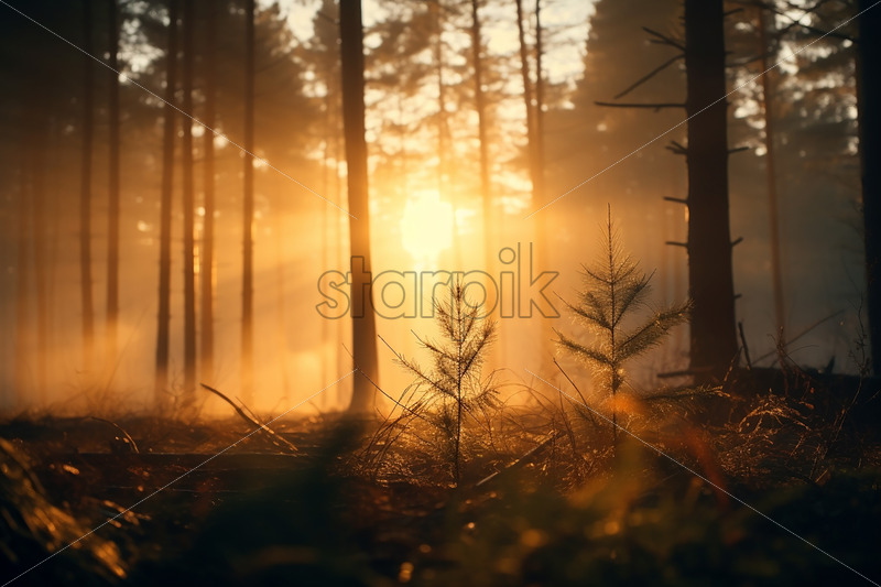 A sunrise in a coniferous forest