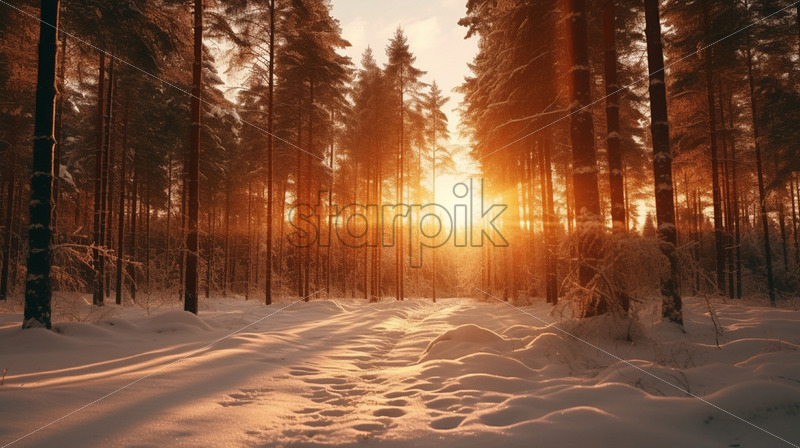 A sunset in the forest in winter