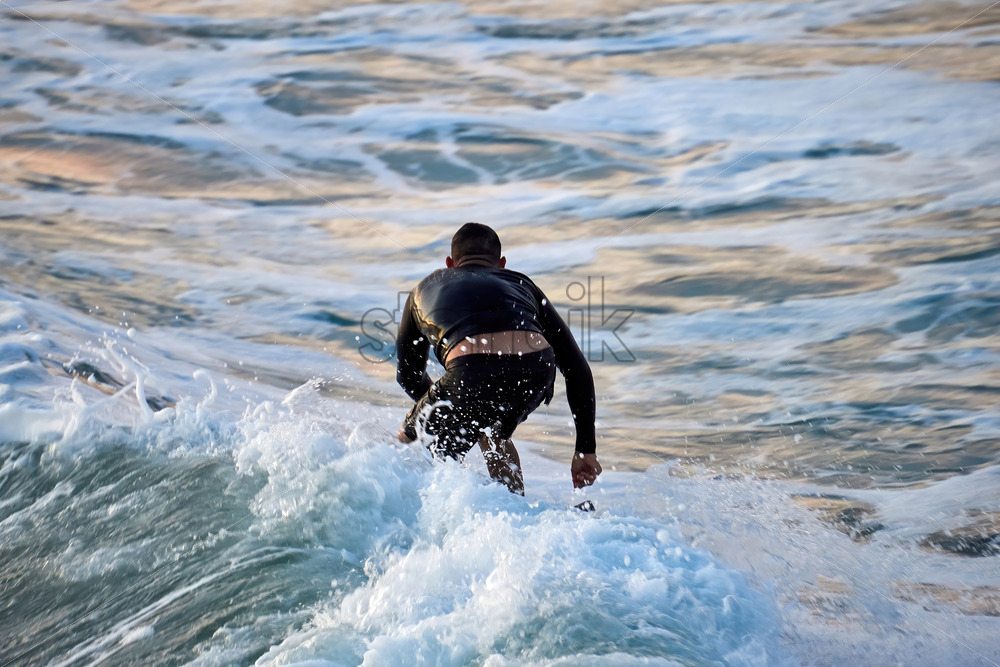 A surfer on a wave near the Santa Monica State beach at sunset in Los Angeles, USA