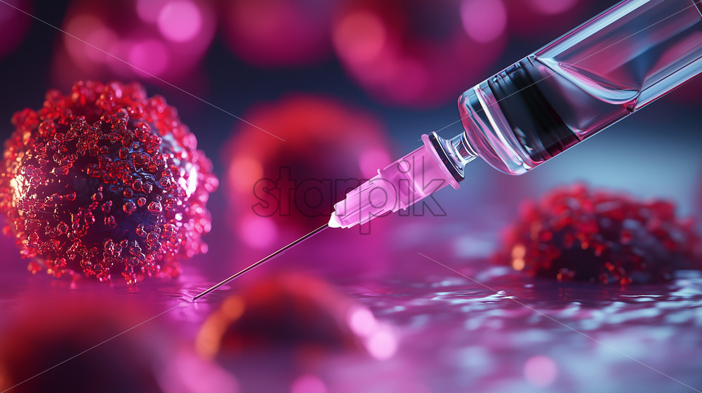 Home » Shop » AI Illustration » A syringe approaches a vibrant cell, preparing to inject a solution in a clean laboratory environment. The focus is on cellular interaction and scientific research processes.