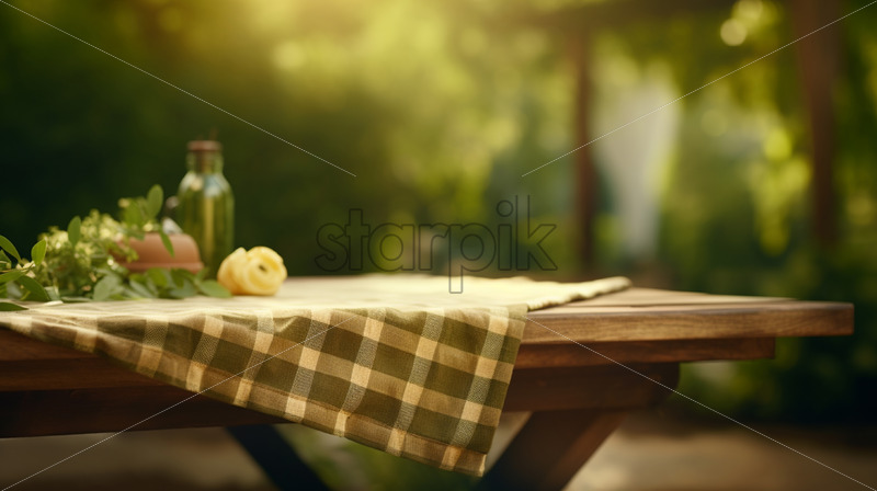 A table on which there is a checkered tablecloth on the background of a blurred greenery
