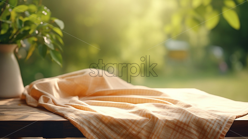 A table on which there is a checkered tablecloth on the background of a blurred greenery