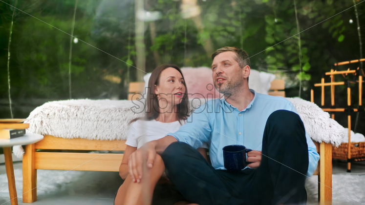 A couple sitting inside a transparent bubble tent at glamping. Sitting under a blanket, holding cups and talking. Lush forest on the background Download royalty free stock video footage Royalty Free Stock Video Footage