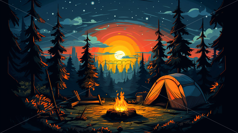Home » Shop » AI Illustration » A tent and a fire in the forest, vector illustration