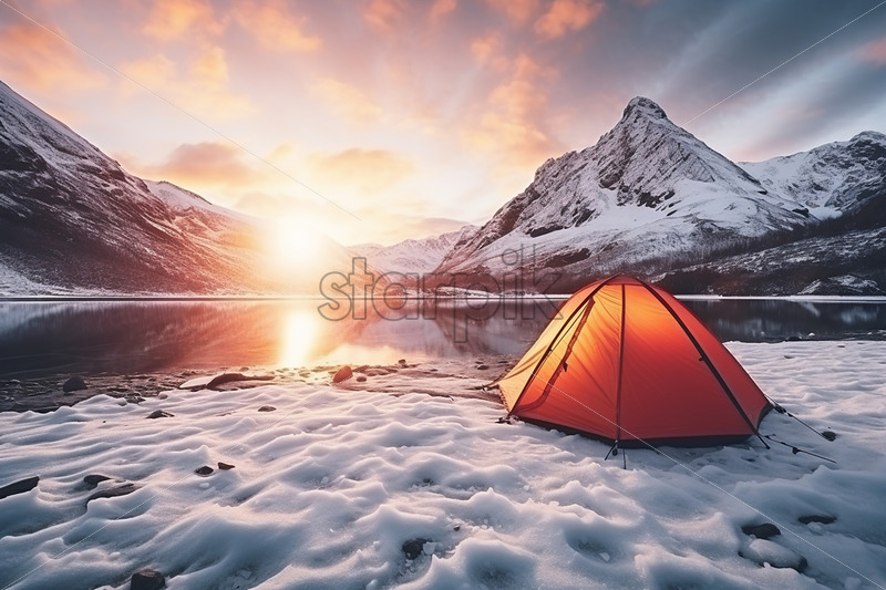 A tent on the shore of a frozen glacial lake