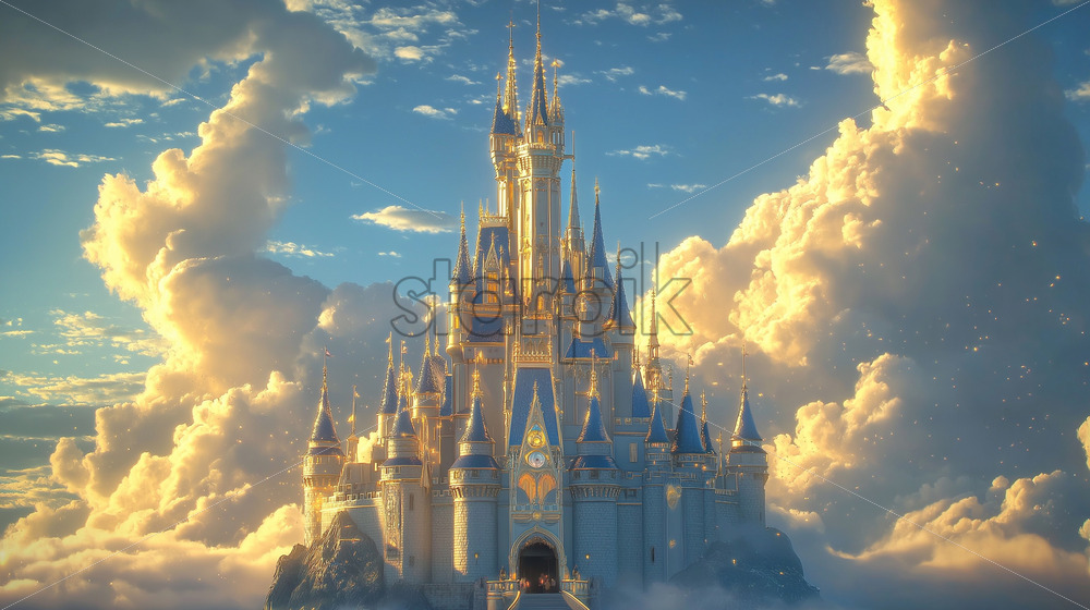 Home » Shop » AI Illustration » A towering castle on a hill, surrounded by clouds and magical lights
