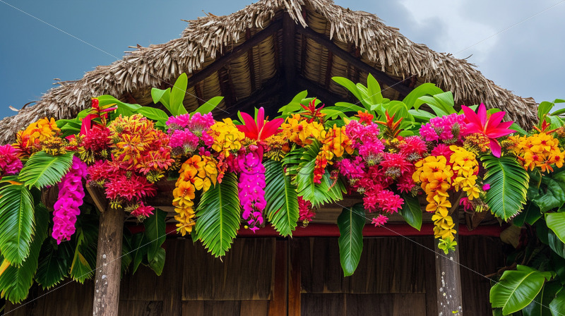 A traditional tiki hut adorned with vibrant floral decorations