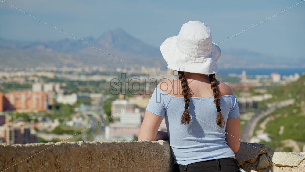 A traveler girl in a white bucket hat takes in the coast from a breezy hilltop lookout in Alicante, Spain Royalty Free Stock Video Footage