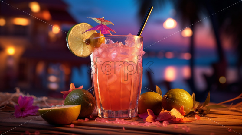 A yellow cocktail with ice on a yellow background with tropical leaves