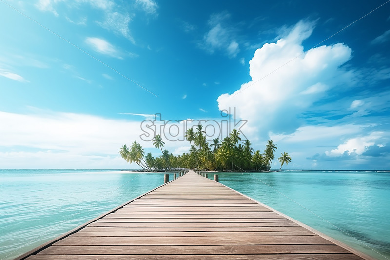 A tropical landscape, with a wood deck on the seashore