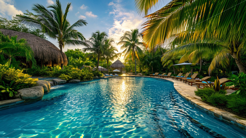 The shimmering surface of a luxurious swimming pool surrounded by palm trees and lounge chairs