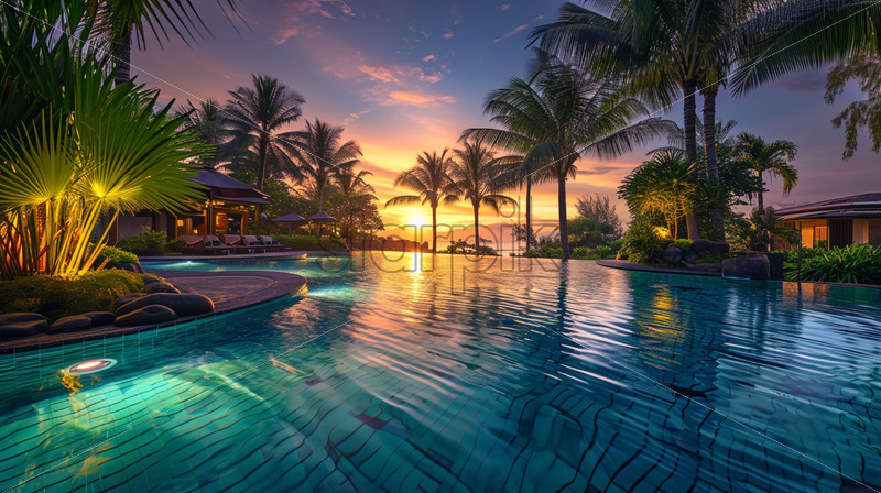 The shimmering surface of a luxurious swimming pool surrounded by palm trees and lounge chairs