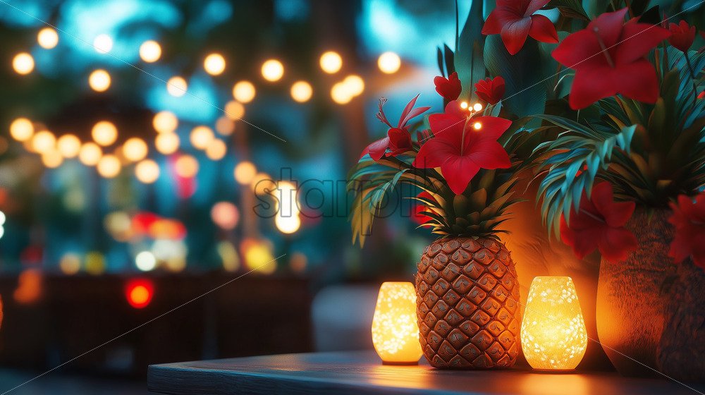 Home » Shop » AI Illustration » A tropical-themed party setup with string lights