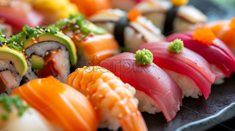 Close up of vibrant red sushi rolls topped with creamy sauce and sesame seeds, served on a ceramic plate Royalty Free Stock Video Footage