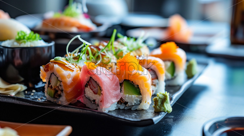 Close up of sushi with a sauce drizzle on a glass tray at a restaurant Royalty Free Stock Video Footage