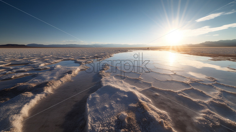 A vast salt flat extending in all directions, reflecting the intense sunlight