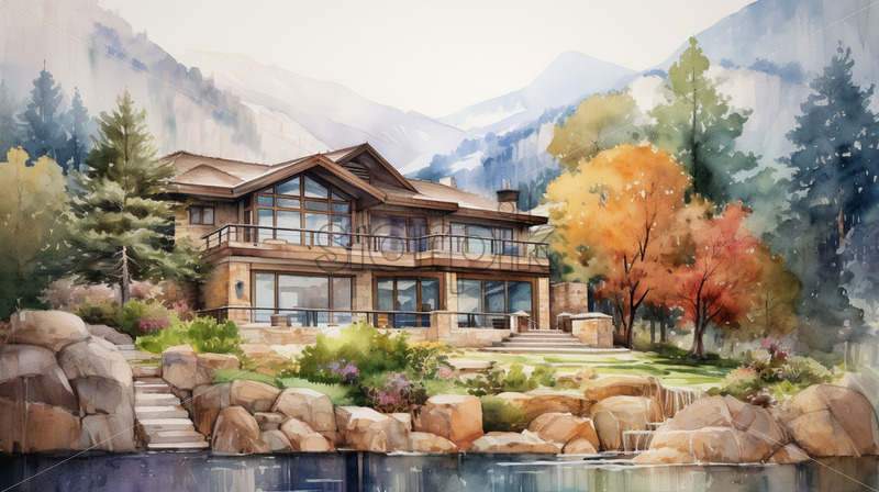 A villa in the mountains, painted in watercolor