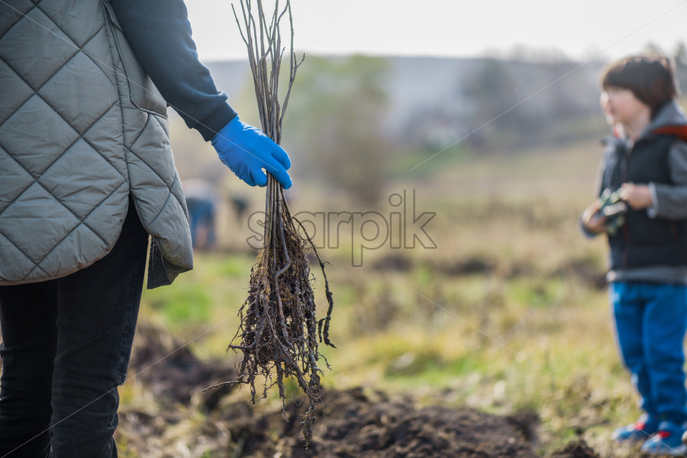 Man at plastic garbage collecting in a polluted park. Rubber gloves, holding a container with plastic bottles. Recycling signs on the T-shirt and container